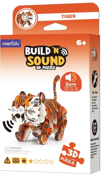 Build 'n' Sound, a 3D Tiger Sound Puzzle. Featuring an integrated sound module, this puzzle emits lifelike animal sounds upon completion. This creatively designed 3D puzzle encourages hands-on exploration of animal anatomy, fosters learning with engaging facts, and enhances children's fine motor skills and patience. With intricate papercraft and an immersive play experience, children can enjoy a sense of accomplishment while learning in a fun and interactive way!