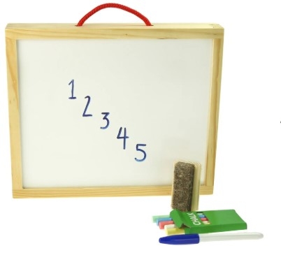 Includes; a box of colored chalk, a dry erase marker, and an eraser
