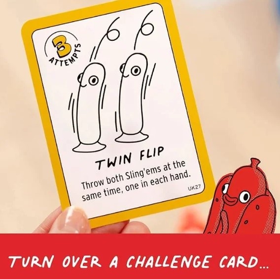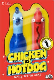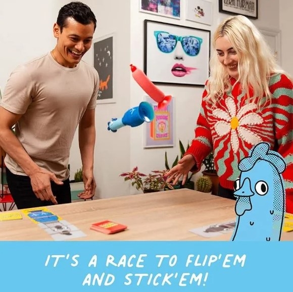 Introducing a family party game about flipping chickens and throwing hot dogs into the air. Still not convinced? Well, keep reading! It’s a race to flip ‘em and stick ‘em. Just turn over a card and flip your character into the air. Nail the landing and you’ll be one step closer to victory.Play the same card as your opponent and you’ll trigger the fast and frantic Flip-o-Rama. First team to nail a landing, wins!
