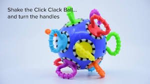A bright and colourful Click Clack Ball, this toy features handles that click with every twist. Filled with tiny beads inside, this baby ball also rattles when shaken. Perfect for infant stimulation and enjoyment.