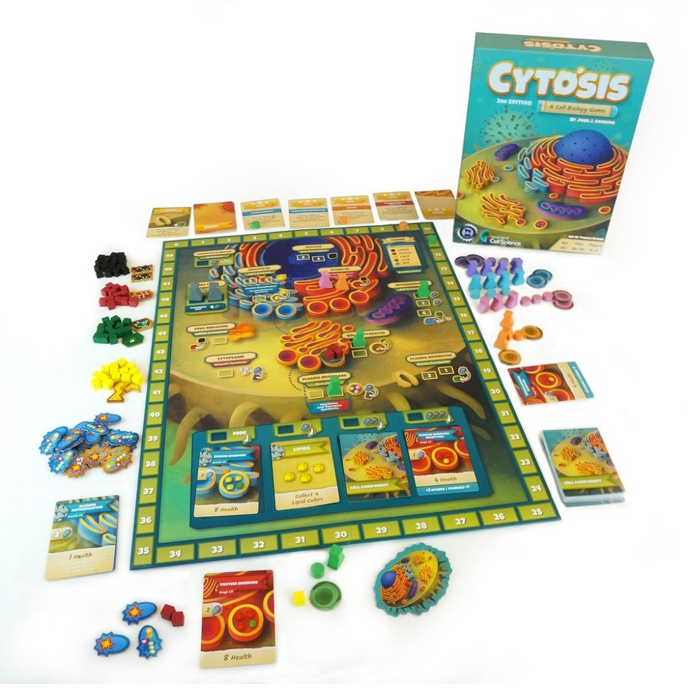 This is a worker placement game that takes place inside a human cell! Players take turns placing workers on available organelles within a human cell in order to collect resources (such as Carbohydrates or ATP!) or take actions (such as purchasing Cell Component cards or translating mRNA into Proteins!) Players use their resources to build Enzymes, Hormones, and Hormone Receptors and also to help detoxify the cell - all of which score health points. The player with the most health points at the end of the game wins! Type of Game: worker placement, resource management, set collection Ages: 10+ Players: 2 - 5 Time: 60 - 90 mins Science Concepts: cell biology, nucleus, free ribosomes, smooth ER, rough ER, golgi apparatus, plasma membrane, mitochondria, enzymes, hormones, receptors, cell detoxification, antibodies and viruses