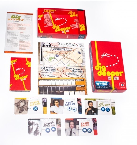 Dig Deeper, written by Rob Daviau, is the first case in the Detective: Signature Series. The story transports players into an American town in the 1970s where their goal will be to solve the mystery of the death of a local politician.