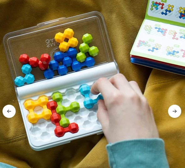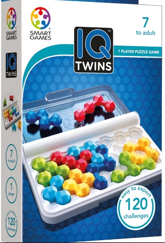 IQ TWINS challenges players to fit ten puzzle pieces - five pairs of same-colour pieces - on the game board. But watch out: the twins are not identical! One piece will only fit on the board at 90° angles, while its twin requires 45°. IQ Twins comes in a handy travel case and includes 120 challenges from easy to expert, making it great for kids and adults.