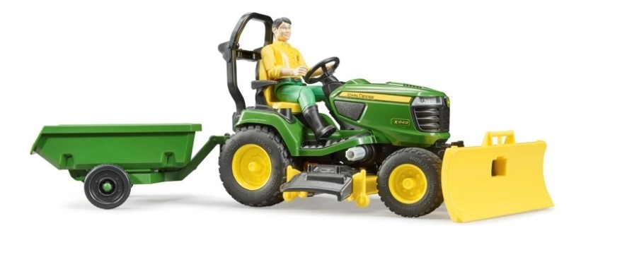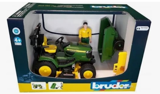 John Deere sit-on lawnmowers are ideal for looking after lawns as they are geared towards convenience, comfort and performance. In this context, the John Deere X949 stands out with extraordinary operating and driving comfort. This sit-on lawnmower is the most recent addition to the ample range of commercial and municipal vehicles by BRUDER. This very detailed model features the roll bar and modern cockpit so typical of this model. The triple mowing unit is height-adjustable and can be removed. This set features a tilting trailer that can be quickly and easily attached to transport tools and gardening waste. However, a gardener is also included to add to the fun so it is possible to get to work straight away.