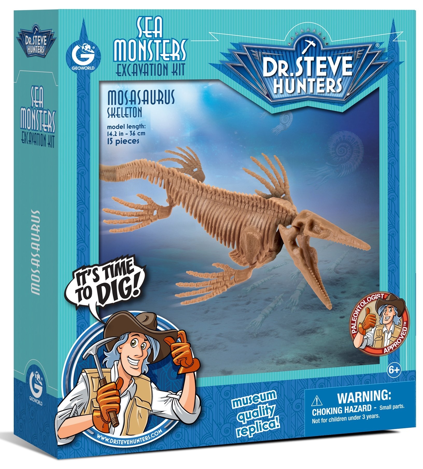 The Mosasaurus Excavation kit includes a 13 piece skeleton of a Mosasaurus set in a plaster block ready to excavate. The paleontologist’s tools (hammer and chisel) are included in the packaging.